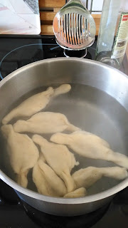 Heute stelle ich euch ein beliebtes Gericht aus Polen vor, PIEROGI.Es ist ein einfaches,doch sehr schmackhaftes Gericht.Es kann frisch zubereitet gegessen werden,schmeckt aber auch gut aufgewärmt.Pierogi sind so eine Art polnische Ravioli,diesen Begriff habe ich aus dem Buch "Rosenmarmelade,ein Sommer in Polen - Rezepte und Geschichten" entnommen.Er gefiel mir gut und passt.Es gibt sie mit verschiedenen Füllungen,die folgende habe ich von meiner Schwiegermutter übernommen und sie ist bei uns in der Familie die beliebteste.Pierogi ist man hauptsächlich im Herbst und Winter,jedenfalls die ,die ich mache.Man kann sie natürlich auch das ganze Jahr über essen.Die polnische Küche ist sehr interessant mit vielen schmackhaften,aber auch kräftigen Gericht und sehr aufwendig in der Zubereitung.Man sollte also etwas Zeit mitbringen.Am Anfang unserer Ehe habe ich sehr viel polnische Gerichte gekocht,doch wie so vieles ist es irgendwann auf der Strecke geblieben.Im Moment gehe ich wieder verstärkt dazu über,vieles selber zu kochen und weniger Fertiggerichte bzw. Fertigprodukte zu verwenden,wie diverse Würzmittel,Fixprodukte usw.Das Brotbacken habe ich auch wieder für mich entdeckt.Das Motto bei uns lautet :"Bei Kannchens alles frisch."